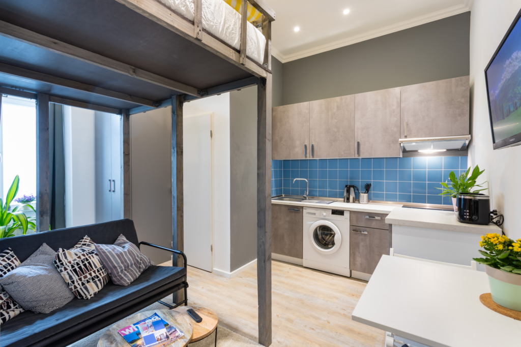 A thoughtfully designed floor plan ensures optimal use of every square meter, combining sleeping, living, and working areas in one functional space.